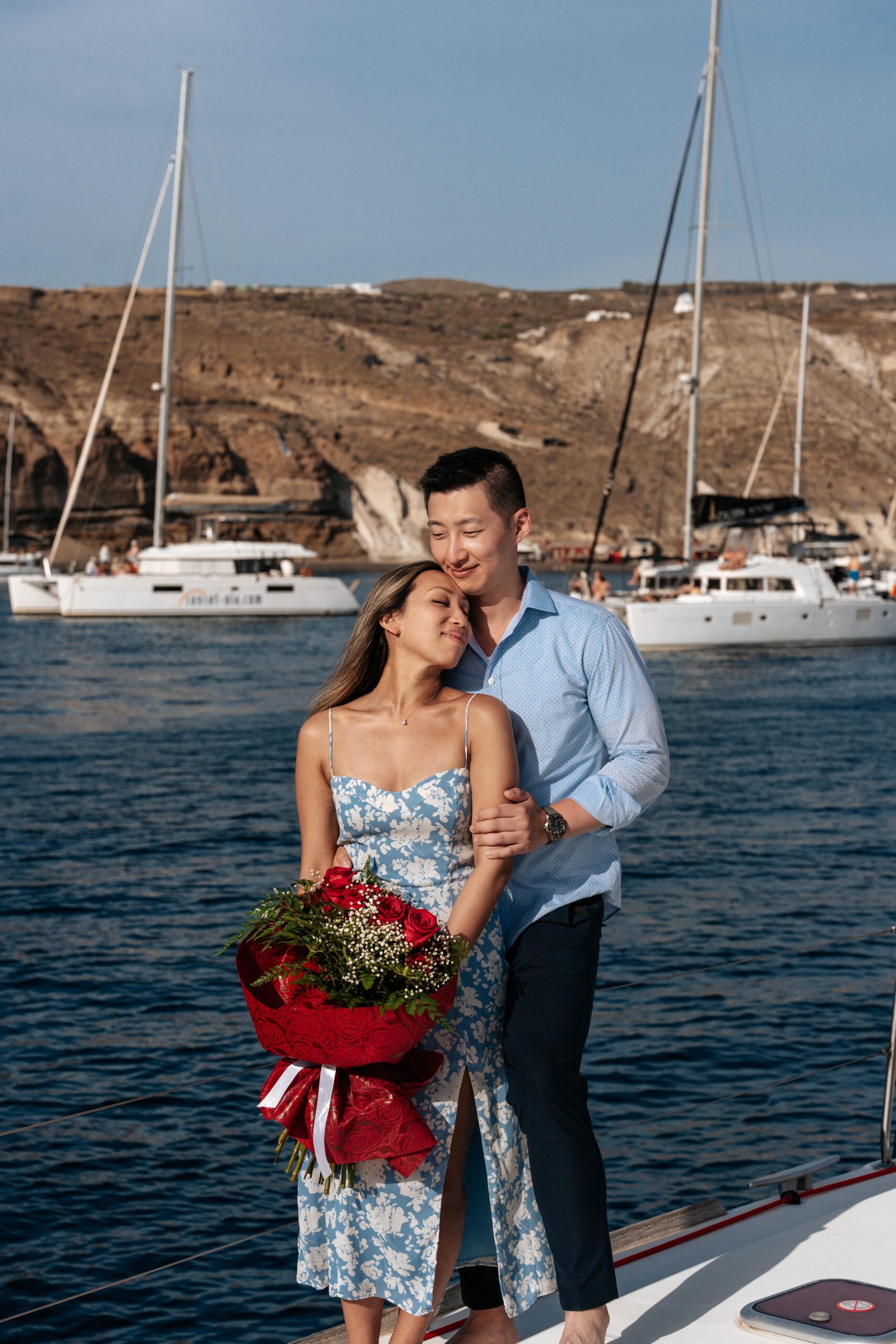 | With the Santorini Catamaran Proposal the concept of the idea is to surprise your partner with the ultimate cruise with an ever lasting impression. Book now an exclusive Santorini Catamaran Proposal and enjoy your special day with your loved one, whilst taking in the view of the breathtaking beauty of Santorini Island! Visit must-see destinations, devour picturesque landscapes, taste Greek flavors and savor local wine, as we will capture your forever moment!